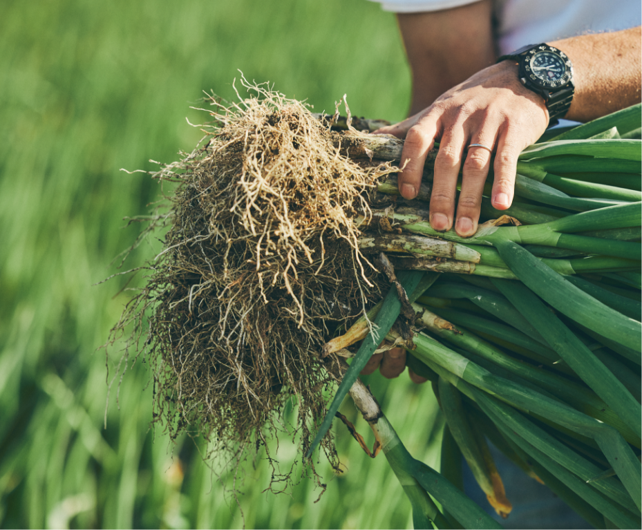 SAMURAIの九条ねぎは手作業で収穫されます。府内隋一の規模を誇る各地の圃場からそ の時々で収穫に最適な場所を選び、1本1本の生育状況を見ながら手作業で収穫します。